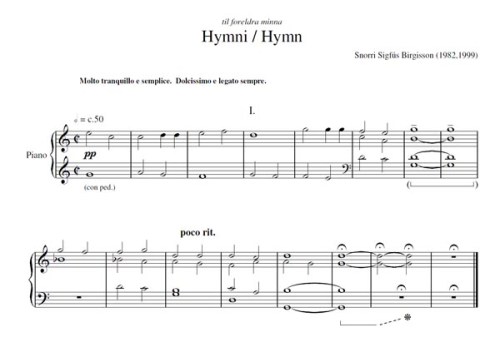 Snorri Sigfús Birgisson (f. 1945) stundaði píanónám fyrst hjá Gunnari Sigurgeirssyni en innritaðist síðan í Tónlistarskólann í Reykjavík. Þar lærði hann á píanó hjá Hermínu S. Kristjánsson, Jóni Nordal og Árna Kristjánssyni en lagði einnig stund á tónsmíðar hjá Þorkeli Sigurbjörnssyni. Hann lauk einleikaraprófi 1974. Þá tók við framhaldsnám í píanóleik hjá Barry Snyder við Eastman School of Music í Bandaríkjunum og tónsmíðanám í Osló hjá Finn Mortensen og hjá Ton de Leeuw í Amsterdam. Veturinn 1978-79 bjó hann í París og árið eftir í London þar sem hann kenndi á píanó. Snorri hefur starfað í Reykjavík sem tónskáld, píanóleikari, tónlistarkennari og stjórnandi síðan 1980. Hann hefur samið einleiksverk, kammertónlist, raftónlist, kórtónlist og sinfónísk verk. Hymni fyrir strengjasveit var saminn árið 1982 fyrir Nýju strengjasveitina og frumflutt undir stjórn höfundar á tónleikum í Bústaðakirkju. Verkið samanstendur af 11 köflum sem allir eru í mixólýdískri tóntegund, mjög stuttir og hægir. Flutningur verksins er hér tileinkaður minningu Önnu Snorradóttur, móður tónskáldsins.
