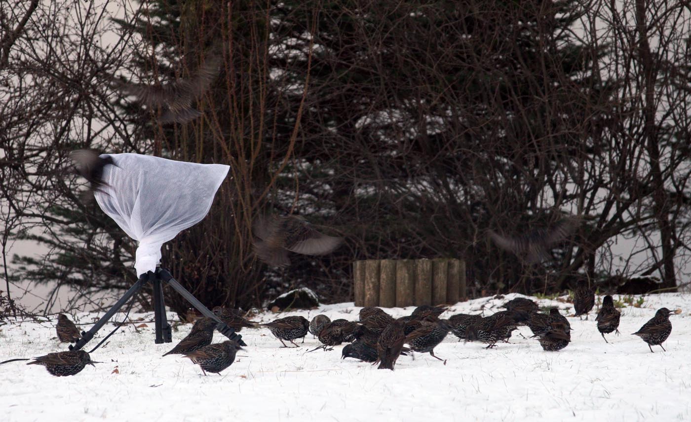 Hér er á ferðinni eins slík upptaka. Eftir nærri fjögurra klukkustunda upptöku kom stór starrahópur í fóðrið sem lagt hafði verið fyrir þá.