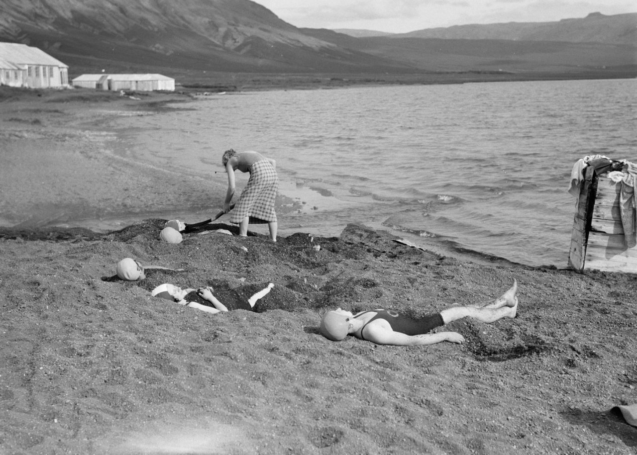 Following picture above shows some people relaxing in hot sand. This shore is just below a big hot spring named “Stóri hver” (not shown on the picture). Today this place between Stóri hver and the lake is so hot that the sand is used every day to bake a bread.