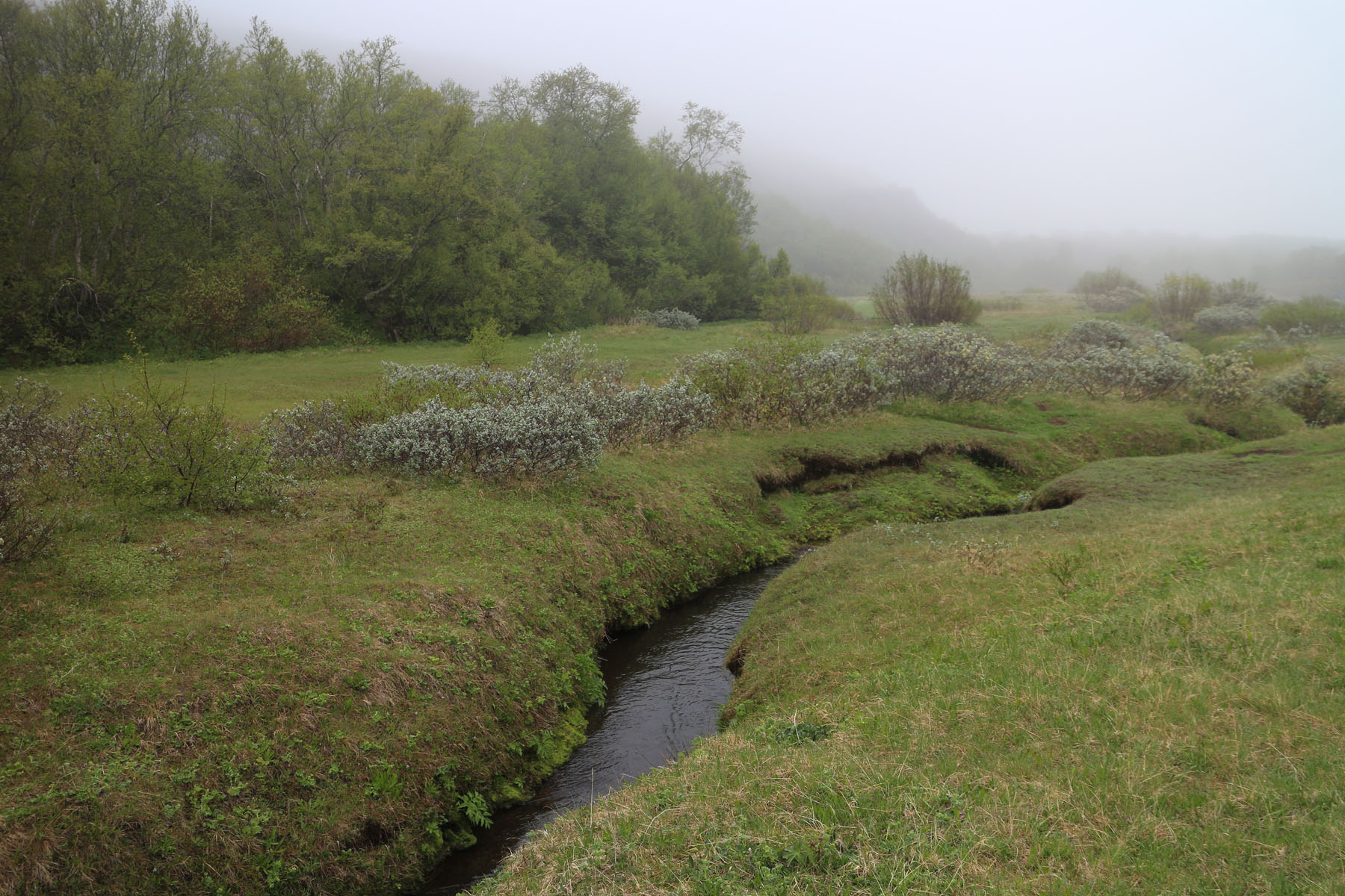 The first week in June 2014 I arrived there on a foggy night and placed the microphones close beside the creek. The soundscape in the fog was particular. The rumble sound from Jökulsá River about 3 km away, filled the air with extreme murky mysterious power. But all around me was a beautiful bird song that followed me in to the sleep.