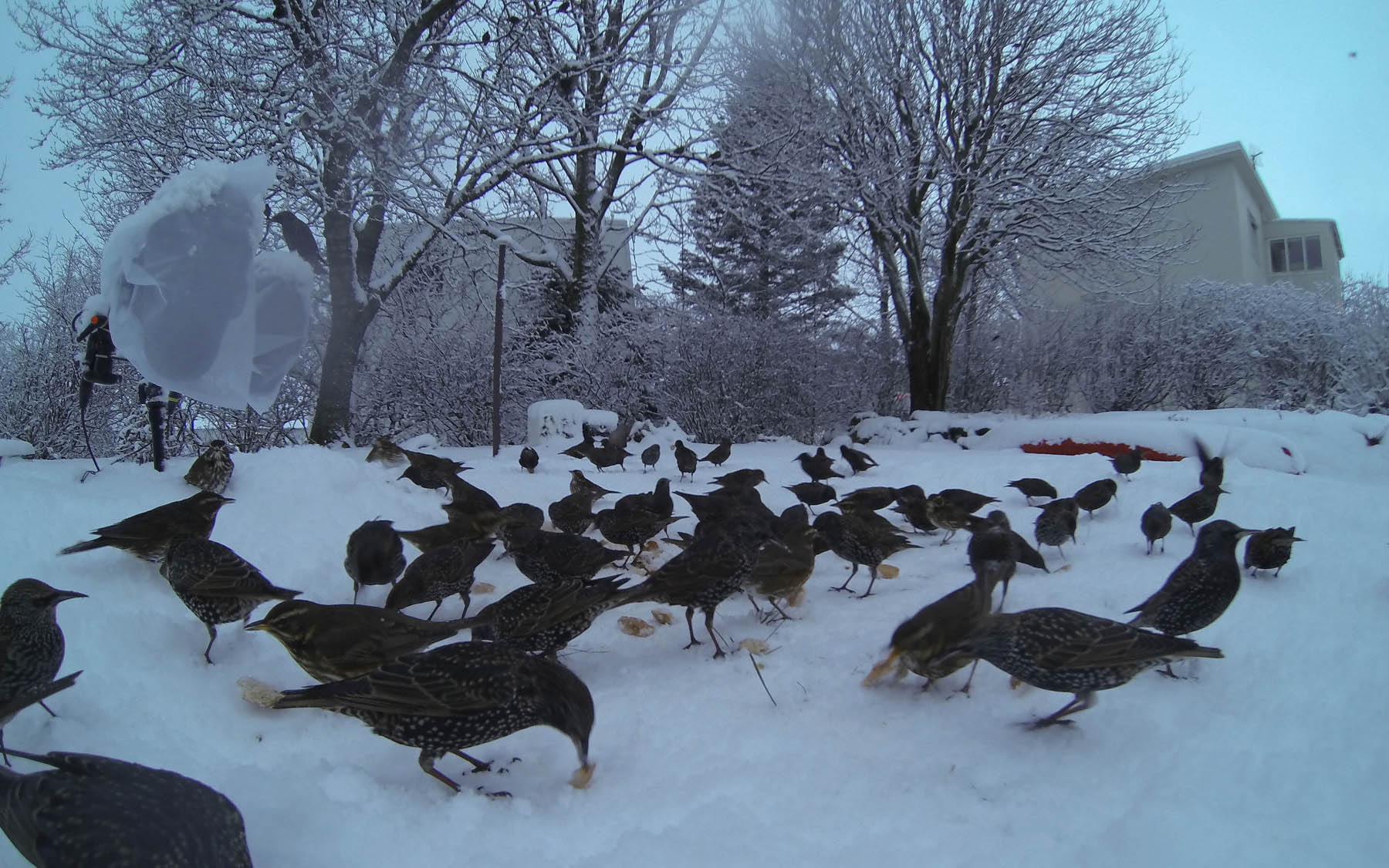 Svo gerist það á næturna þegar enginn sér til að heilu hryggjarstykkin og bein hverfa. Þar grunar mig að hrafninn sé að verki eða máfurinn. Þá þvælist köttur alla daga í fóðrið á leið sinni um garðinn. Þá kemur stundum semma á morgnana risavaxinn hundur og étur allt kjötmeti sem annars hefði átt að fara í fuglana