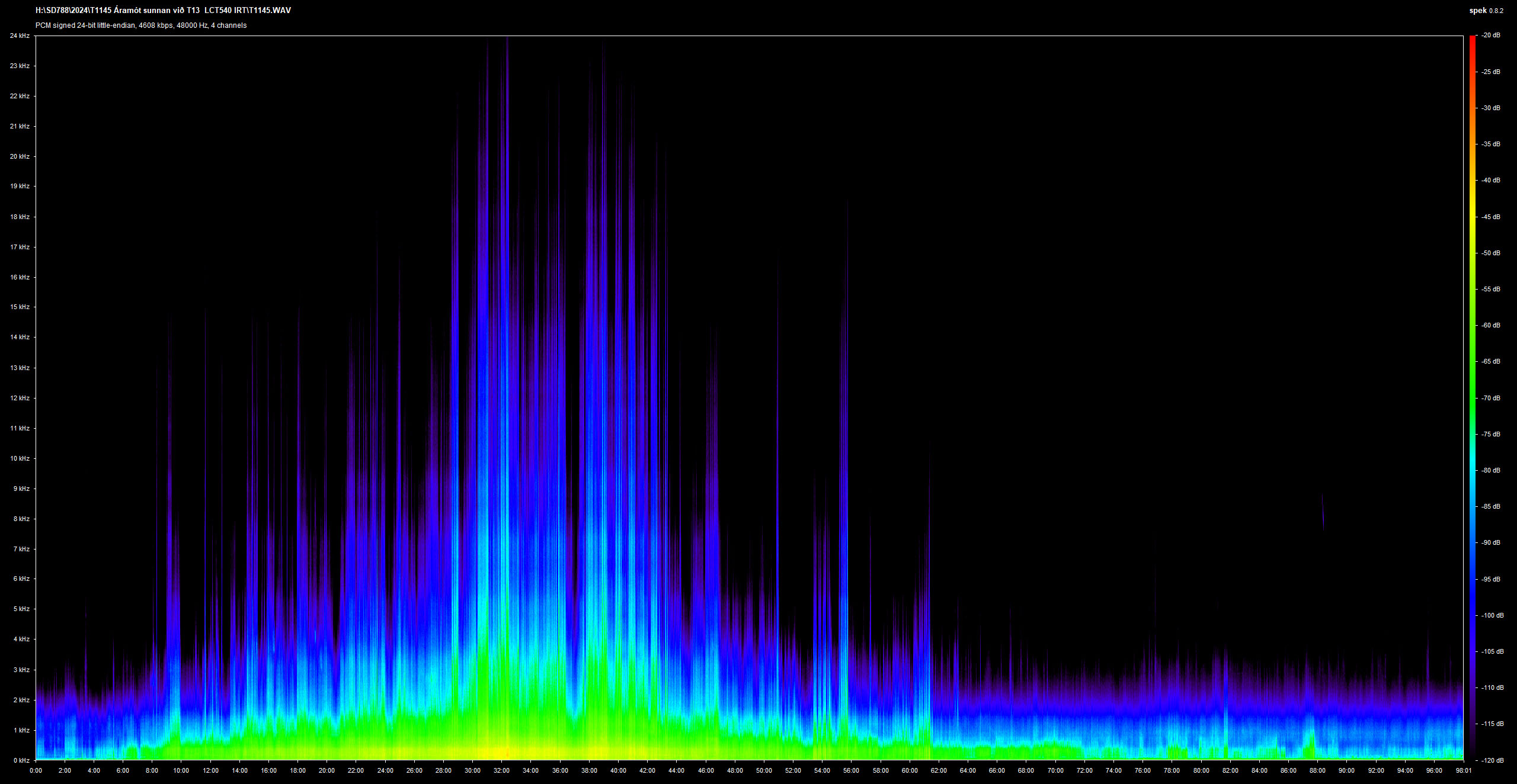 Following picture shows the spectrogram of the whole recording this new years eve. But following recording start at 22:30min. Midnight is at 30:00min and the recording end at 52:30min