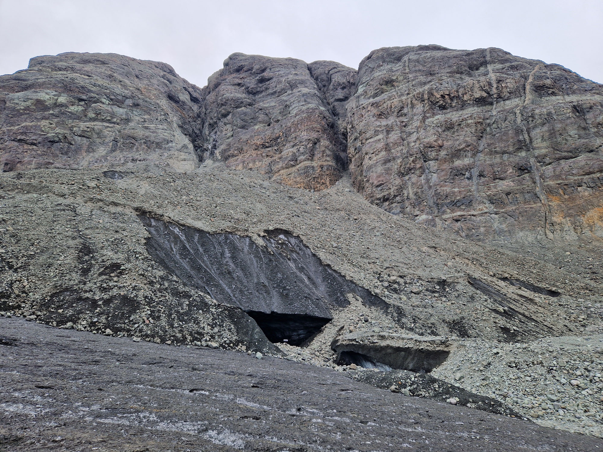For centuries, the glacier has scraped the slopes of the mountains in Suðursveit. When the glacier retreated, gravel and rocks fell from the mountain slopes on the glacier below, which then formed a thick insulating layer over the ice closest to the mountain slopes. Under normal circumstances for centuries, the advance of the glacier would have carried this gravel down to the glacier toe. But the glacier has for two decades stopped advancing in this place. The glacier has lost all its mass so it will not crawl anymore in this place. The glacier lies flat and dirty towards the sun in the south, thin and melts rapidly. However, the ice that is covered with gravel and rocks melts much more slowly. Therefore, e.g. still possible to see ice high up on the mountain slope of Vestur Miðfell, although it is probably 30-40 years since the glacier was there and reach so high in the mountain slope